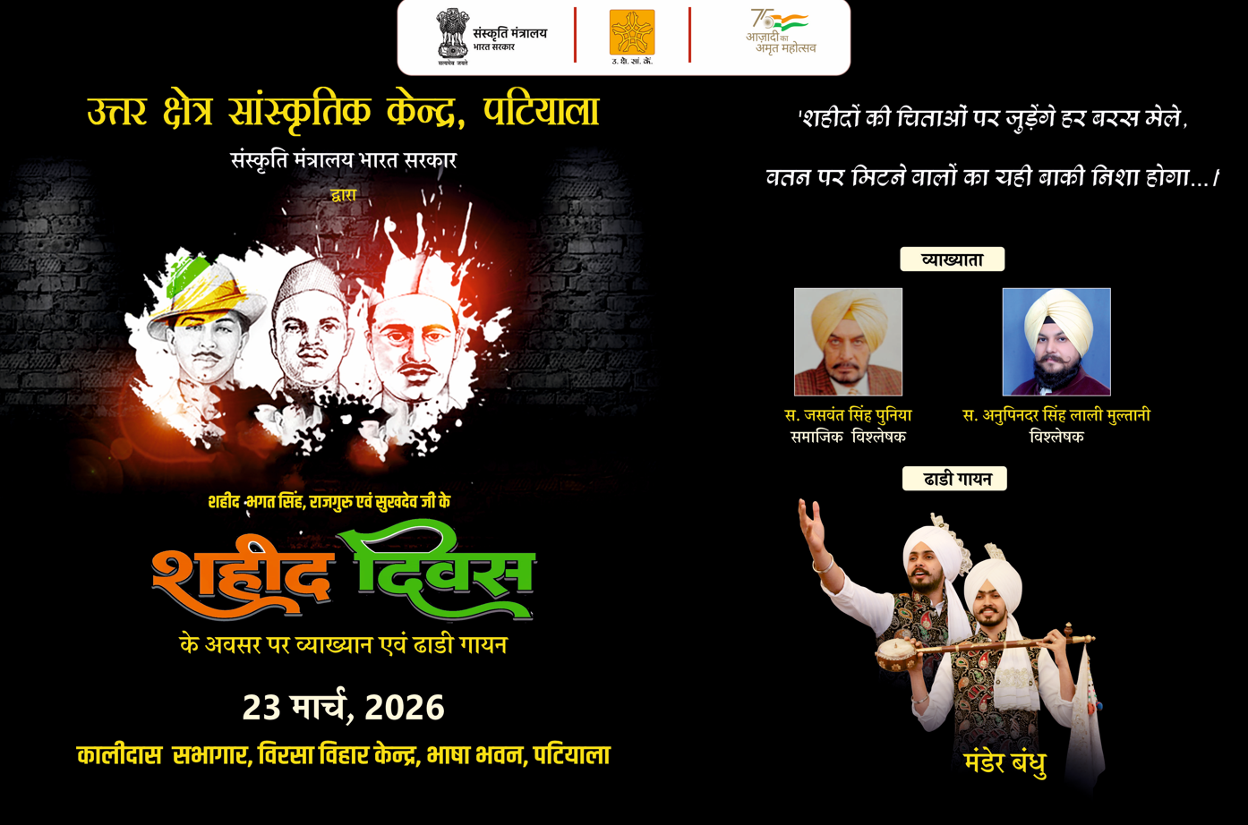 North Zone Cultural Centre, Patiala, Ministry of Culture, Governmrnt of India going organize Lecture and Dhadi Gayan on the death anniversary of Shaheed Bhagat Singh, Rajguru & Sukhdev on March 23, 2026 at Kalidasa Auditorium, Virsa Vihar Kendra, Patiala.